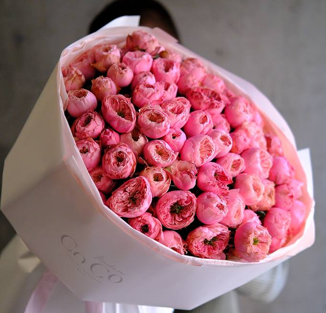 Склад: розмір S - 9 гілочок кущових троянд, пакування; розмір M - 25 гілочок кущових троянд, пакування; розмір L - 101 гілочка кущових троянд, пакування.