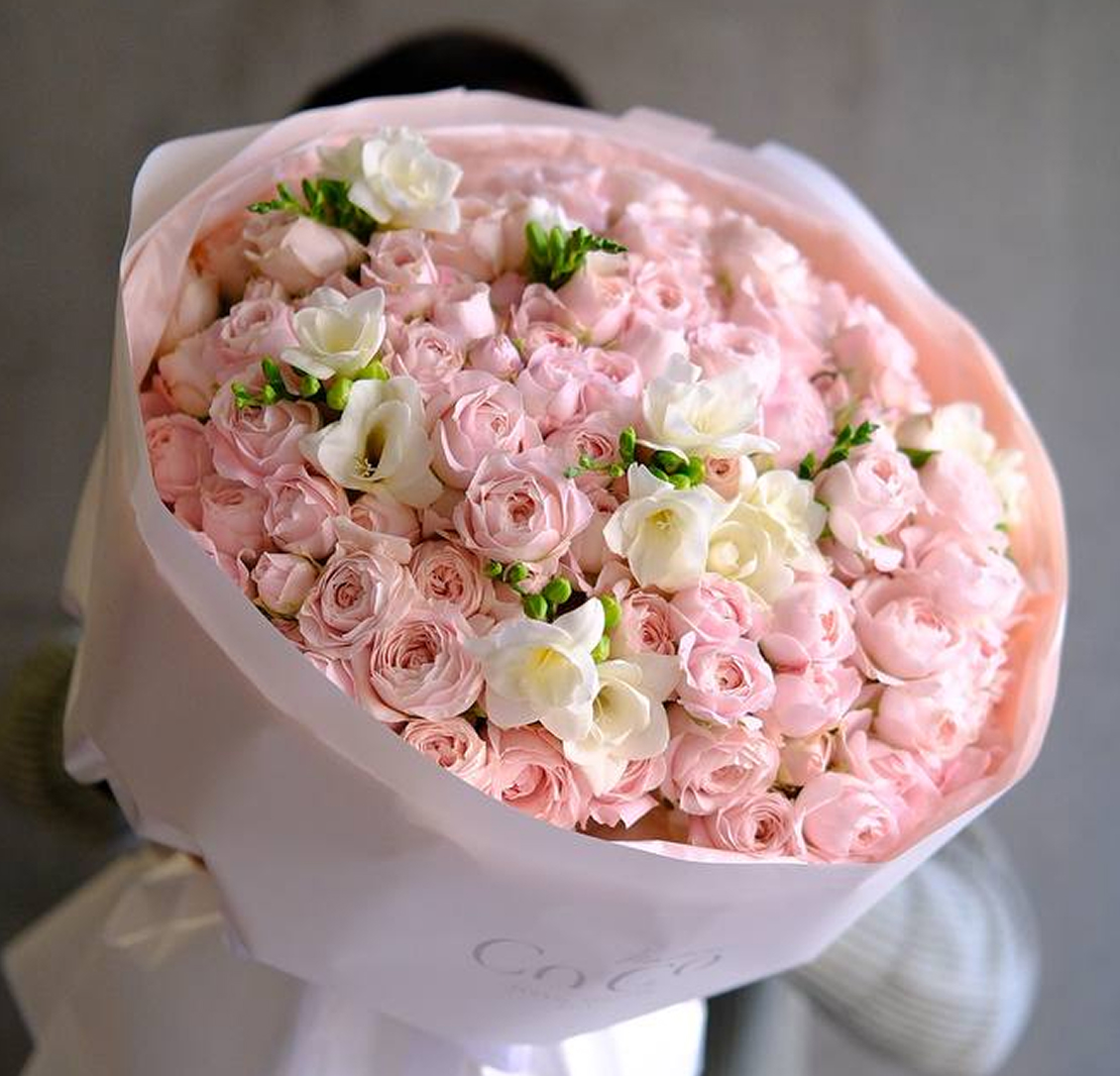 Склад: 21 гілочка кущових троянд, 9 фрезії, пакування.