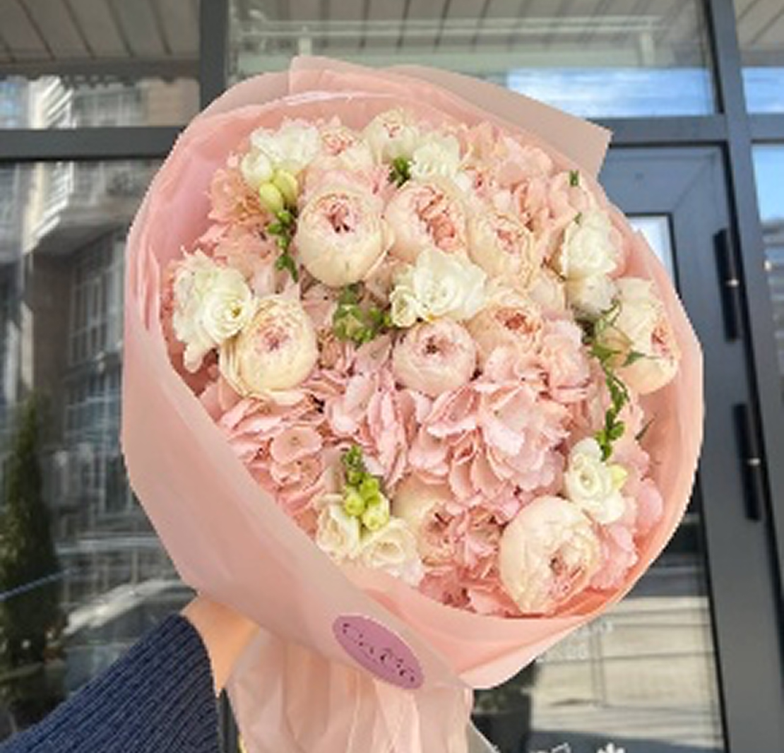 Склад: гортензії Колумбія 4 шт, троянда кущова Мансфілд Парк 9 шт, фрезії 9 шт, пакування.