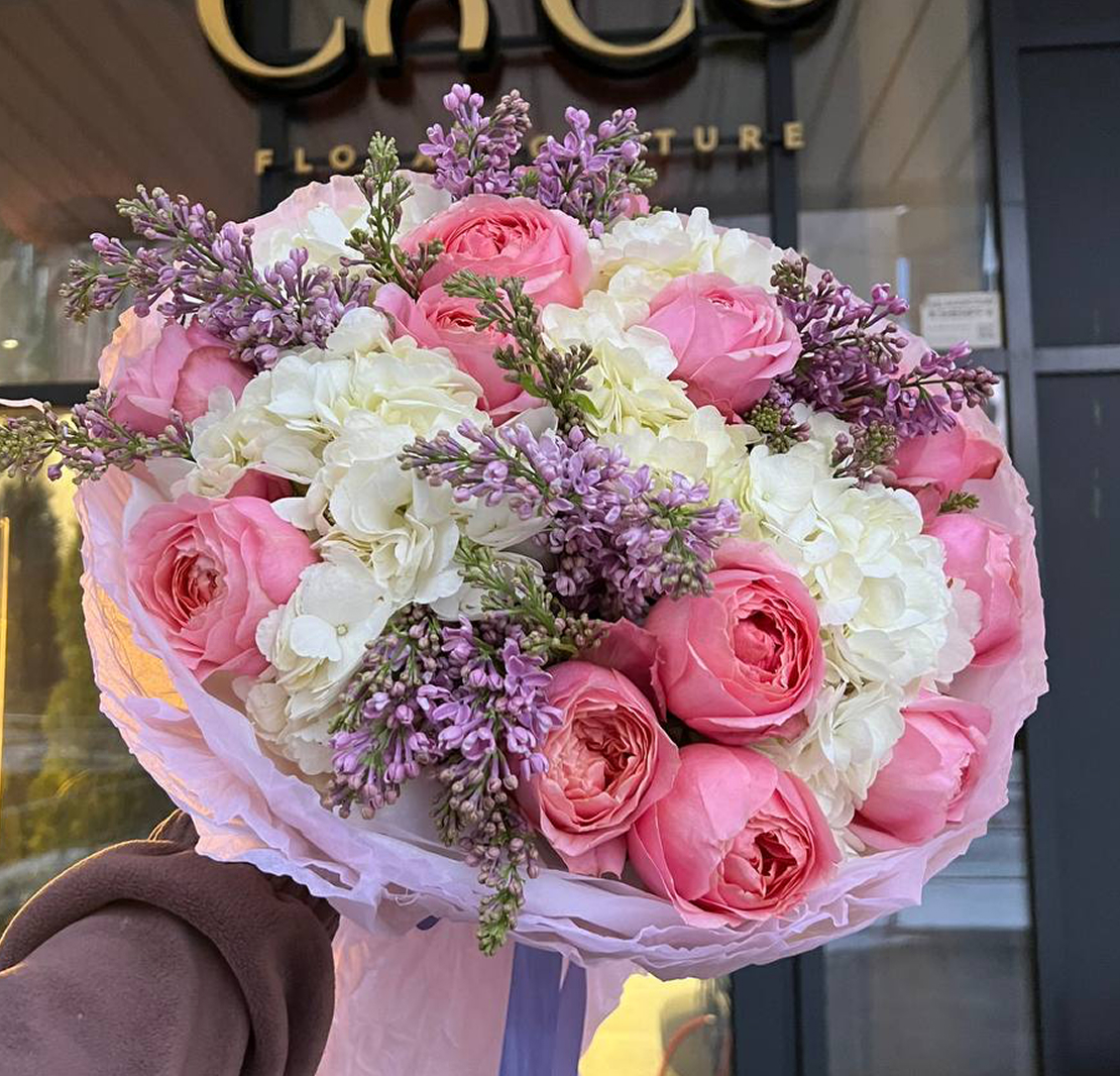Склад: гортензія Кенія 5 шт, бузок 6 шт, троянда одноголова 15 шт, пакування.