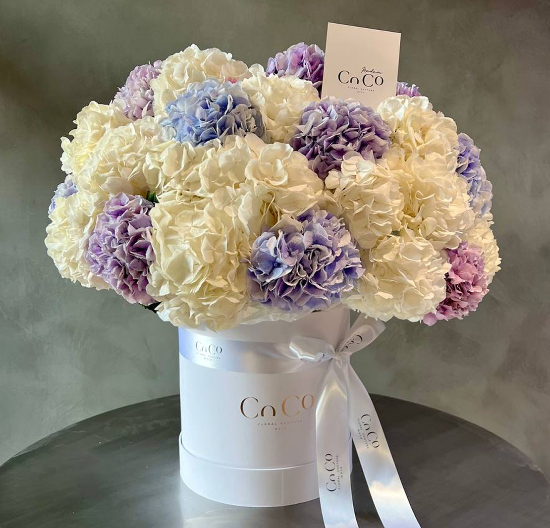 Склад: гортензія Кенія 15 шт, гортензія Голландія 12 шт, коробка (25см*25см).